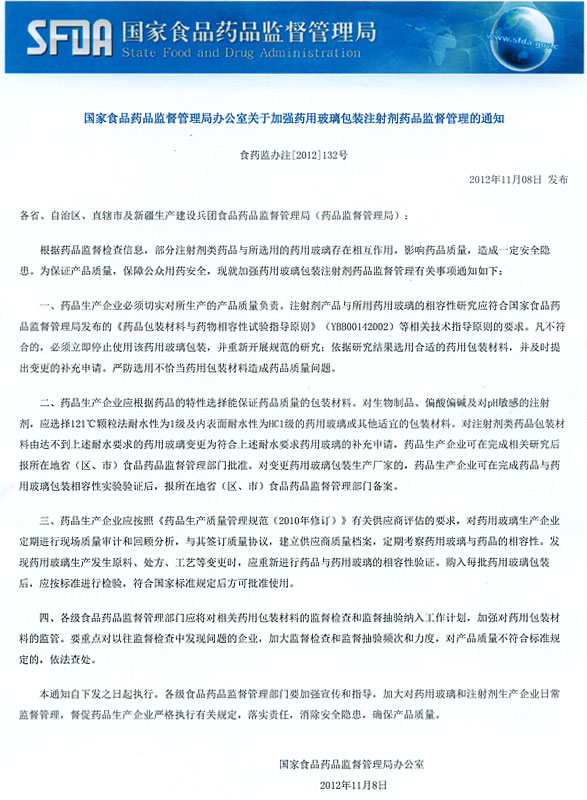 國家食品藥品監(jiān)督管理局辦公室關(guān)于加強(qiáng)藥用玻璃包裝注射劑藥品監(jiān)督管理的通知